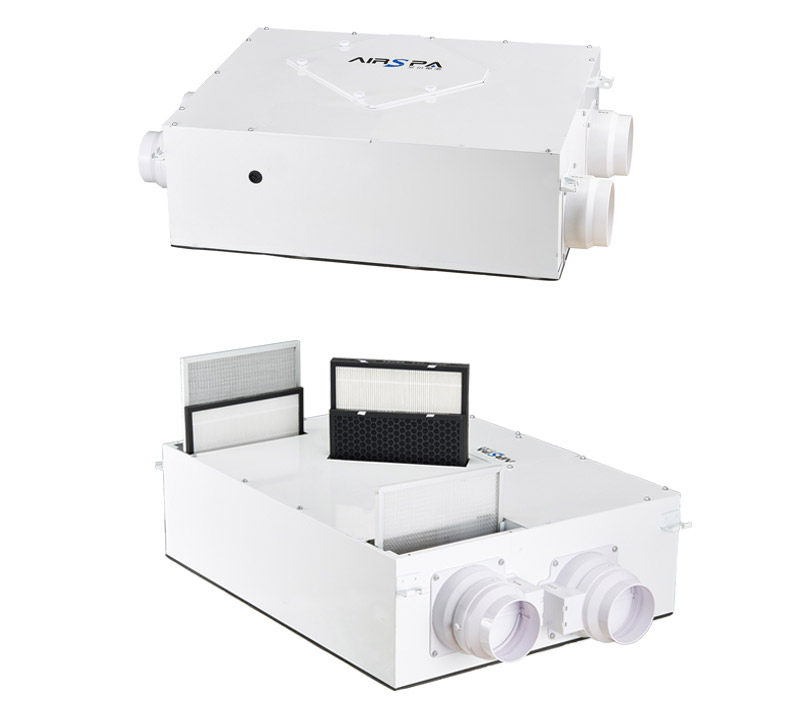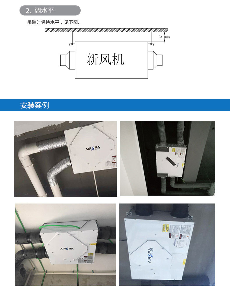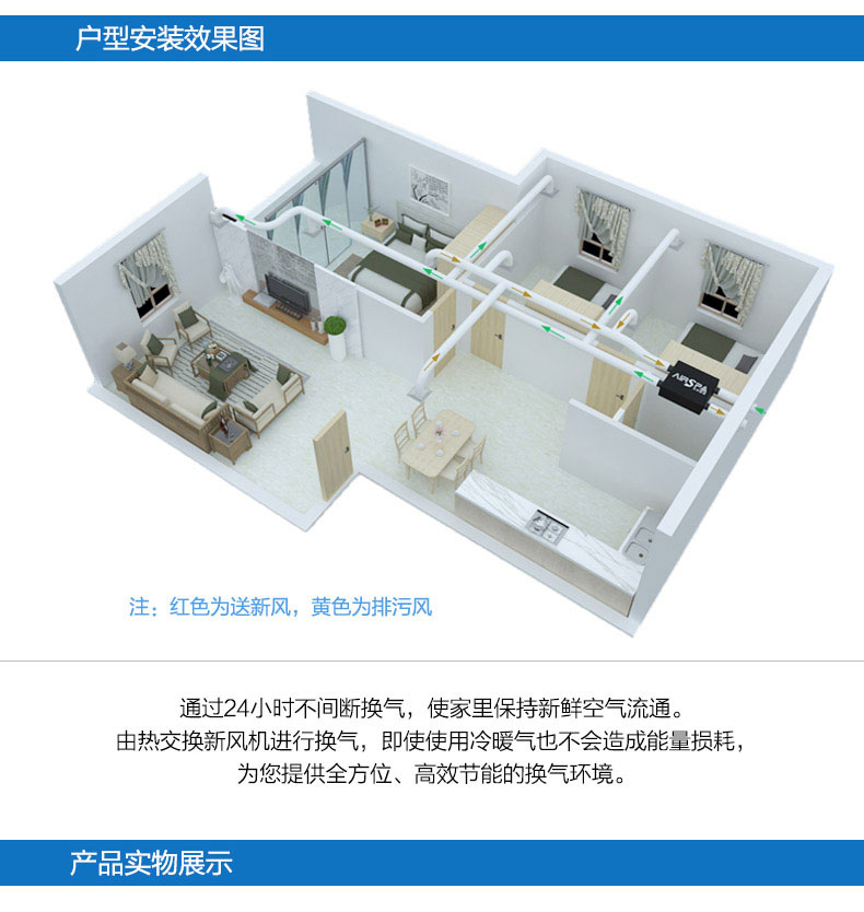 雙向流新風機:訂機采用雙核動力設計,動力強,體積小;采用直流無刷電機,低噪音,低能耗